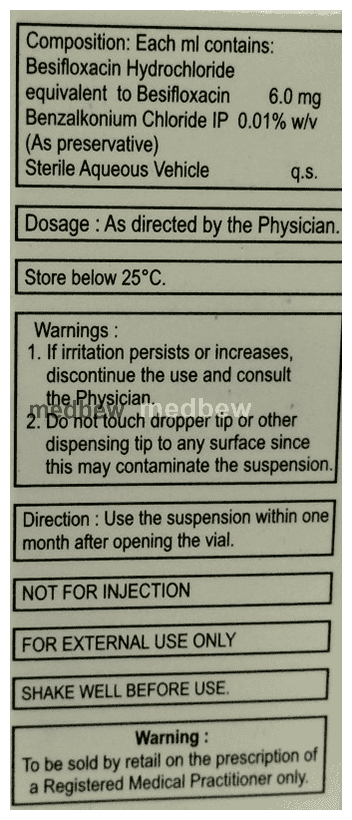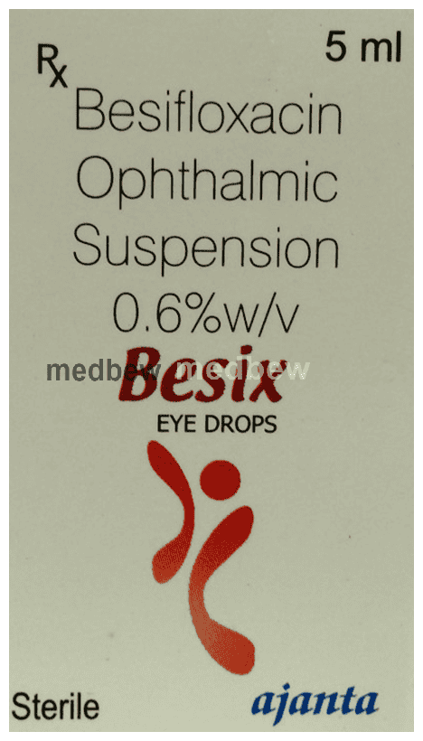 Besix Eye Drop is an antibiotic, used in the treatment of bacterial infections of the eye. It relieves the symptoms of the infection by stopping the further growth of the causative microorganisms.