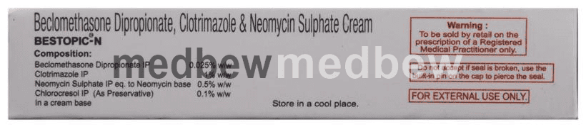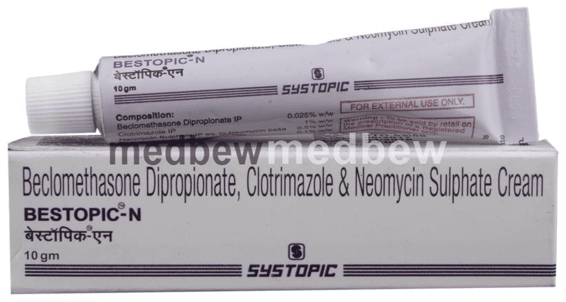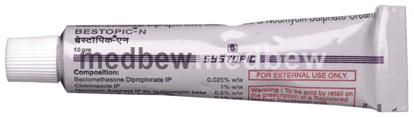 Bestopic N Cream is a combination of three medicines: Beclometasone, Neomycin and Clotrimazole which treat skin infections. Beclometasone is a steroid which blocks the production of certain chemical messengers (prostaglandins) that make the skin red, swollen and itchy. Neomycin is an antibiotic which stops the growth of bacteria while Clotrimazole is an antifungal which stops the growth of fungi on the skin. Together, they treat your skin infection effectively.