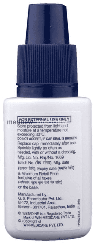 Betadine Powder is a versatile antiseptic that is used for the treatment and prevention of infection. Betadine Powder kills and prevents the growth of infection-causing microbes, thereby preventing abrasions, cuts, and wounds, or any break in the skin from getting infected. The antiseptic effect is caused due to the slow release of iodine. Keep the affected area clean and use the medicine as prescribed by your doctor.