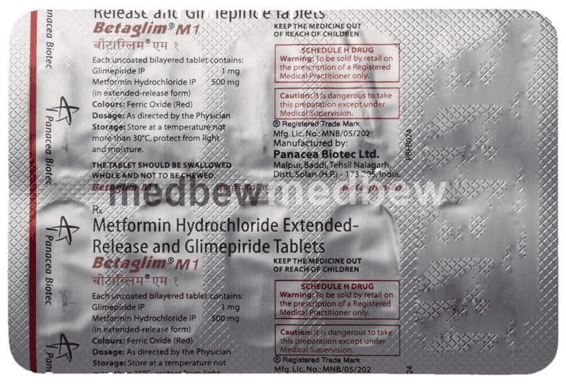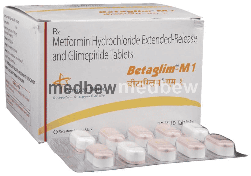 Betaglim-M 1 Tablet ER is an antidiabetic medication. It works by increasing the amount of insulin released by the pancreas in order to lower blood glucose.
