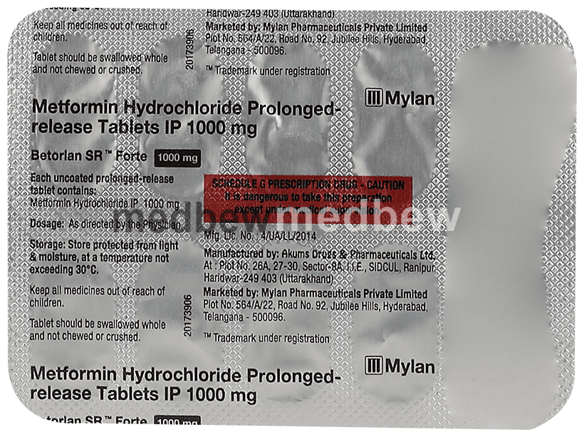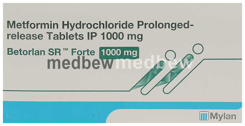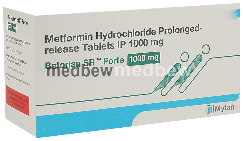 Betorlan SR Forte 1000mg Tablet is a medicine used to treat type 2 diabetes mellitus. It helps control blood sugar levels and thus prevents serious complications of diabetes. It is also used to treat a menstruation-related disorder known as polycystic ovary syndrome (PCOS) in women.