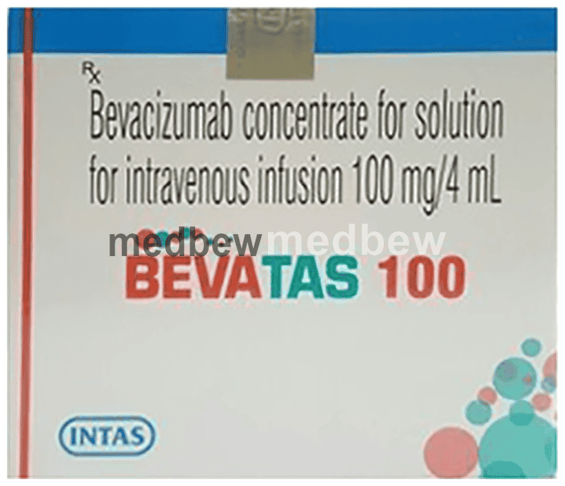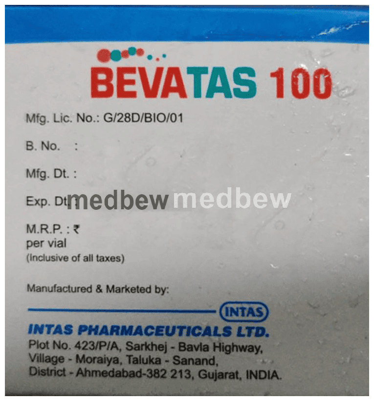 Bevatas 100 Injection is an anticancer medication. It is used in the treatment of cancer of colon and rectum, non-small cell lung cancer, kidney cancer, brain tumor, ovarian and cervical cancer. It helps to prevent the growth of new blood vessels that feed tumors and stops tumors from growing.