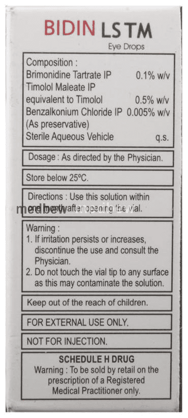 Bidin LS TM Eye Drop is a prescription medicine used for the treatment of pressure in the eyes (ocular hypertension) and glaucoma. It works by decreasing the pressure of fluid in the eye (aqueous humor), which helps in lowering the increased eye pressure.