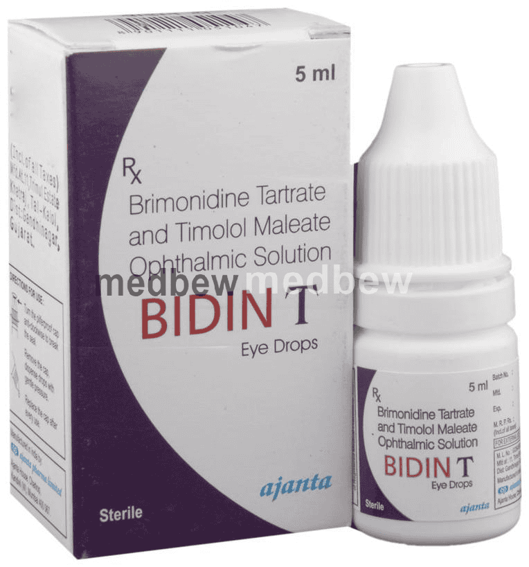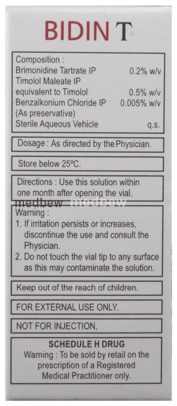 Bidin T Eye Drop is a prescription medicine used for the treatment of pressure in the eyes (ocular hypertension) and glaucoma. It works by decreasing the pressure of fluid in the eye (aqueous humor), which helps in lowering the increased eye pressure.