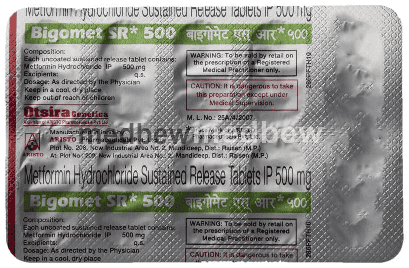 Bigomet SR 500 Tablet is a medicine used to treat type 2 diabetes mellitus. It helps control blood sugar levels and thus prevent serious complications of diabetes. It is also used to treat a menstruation-related disorder known as Polycystic ovary syndrome (PCOS) in women.