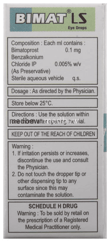 Bimat LS Eye Drop is a medicine used to reduce pressure in the eyes in adults with glaucoma and high pressure in the eye. If the pressure in your eye is too high it can damage your sight, potentially leading to blindness. It works by helping fluid flow from inside the eye into the blood.