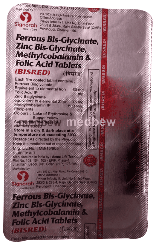 Bisred Tablet is a combination of four medicines: Ferrous Bisglycinate, Zinc bisglycinate, Folic Acid, and Methylcobalamin. Ferrous Bisglycinate is an anti-anemic medication. It replenishes the iron stores in your body. Iron is vital for the formation of new red blood cells and hemoglobin, a substance that gives these cells the ability to transport oxygen. Zinc bisglycinate is a dietary supplement of zinc that provides essential nutrients. Folic Acid is a form of vitamin B. It plays a vital role in the formation of red blood cells, which carry oxygen throughout the body. It is also essential in pregnancy due to its role in the development of the unborn baby’s brain and spinal cord. Methylcobalamin is a form of vitamin B12 that restores its level in the body thereby helping in treating certain anemias and nerve problems.