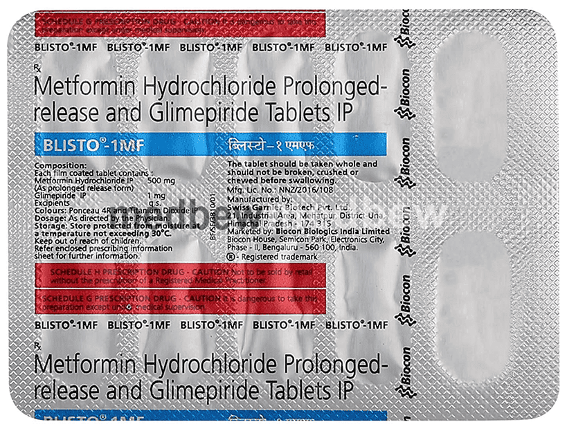 Blisto 1MF Tablet PR belongs to a category of medicines known as anti-diabetic drugs. It is a combination of two medicines used to treat type 2 diabetes mellitus in adults. It helps control blood sugar levels in people with diabetes.