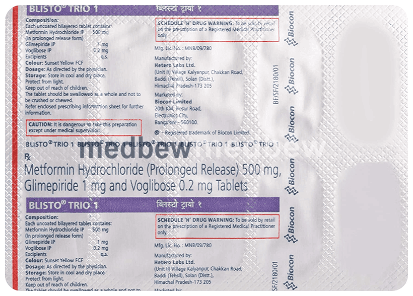 Blisto Trio 1 Tablet PR belongs to a category of medicines known as anti-diabetic drugs. It is a combination of medicines used to treat type 2 diabetes mellitus in adults. It helps control blood sugar levels in people with diabetes.