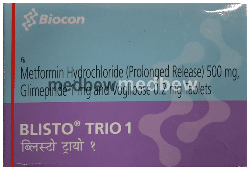 The most common side effect of Blisto Trio 1 Tablet PR is low blood glucose levels (hypoglycemia). Make sure you recognize the signs of having low blood glucose levels, such as sweating, dizziness, headache, and shaking and know how to deal with it. To prevent this, it’s important to have regular meals and always carry a fast-acting source of glucose such as sugary food or fruit juice with you. Drinking alcohol can also increase your risk of low blood sugar levels and should be avoided. Other side effects that may be seen on taking this medicine include taste changes, nausea, diarrhea, stomach pain, headache, edema (swelling), blurred vision, bone fracture, and upper respiratory tract infection. Some people may find that they put on weight with this medicine.