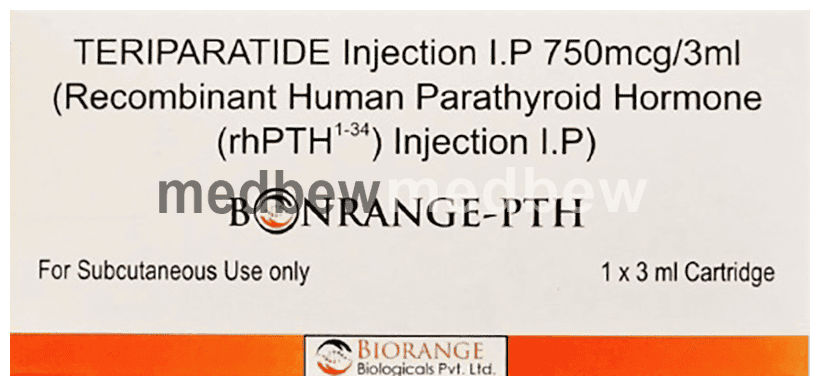 Bonrange-PTH Injection should be injected under the skin or given by a healthcare professional. You should use it regularly and at the same time each day to get the maximum benefit from it. Usually, it is recommended to take it for a maximum period of 2 years. However, follow the doctorโs advice and complete the course even if you feel better. It should be stored in the refrigerator at a temperature ofย 2ยฐC to 8ยฐC.Some common side effects of this medicine include joint pain, injection site reactions (such as pain, swelling, and redness) and leg cramps. consult with your doctor if any of these bother you or do not go away.ย Before taking this medicine, let your doctor know if you have kidney stones or any other kidney problems, as it can cause an increase in the amount of calcium in blood or urine. Pregnant and breastfeeding mothers should also consult with their doctors before taking this medicine. Your doctor may advise a bone scan to monitor the progress of your treatment.