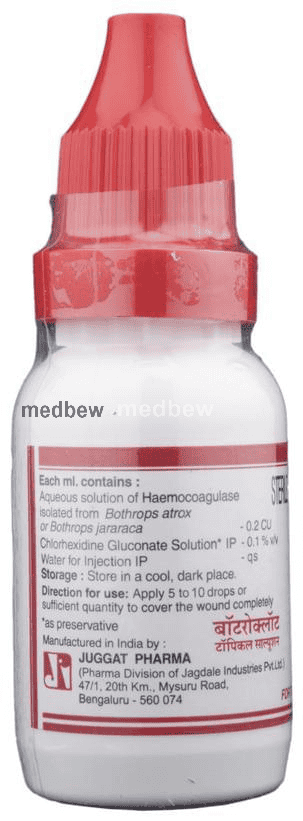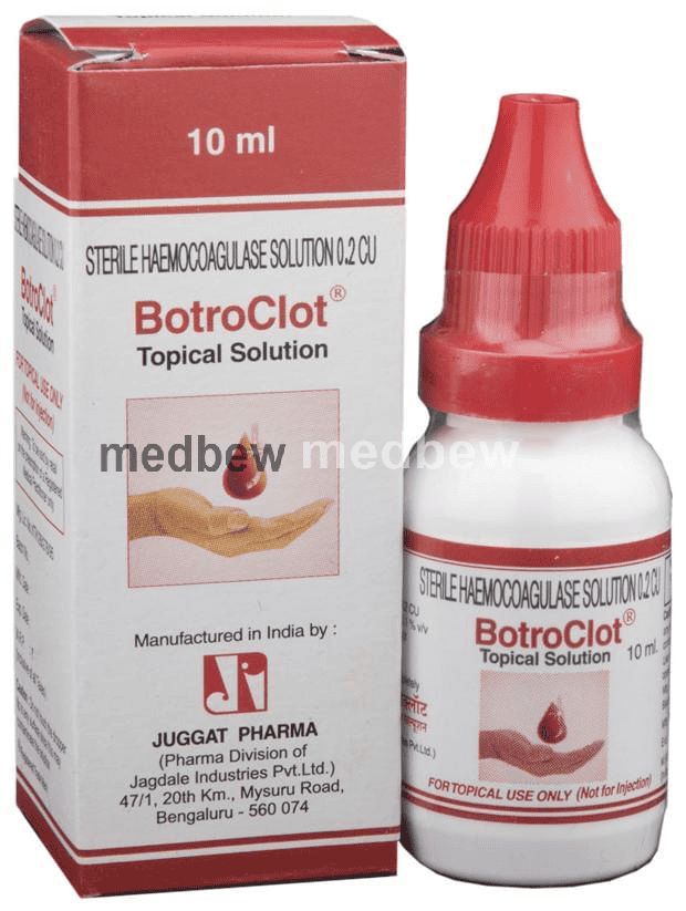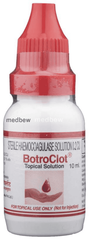 Botroclot Topical Solution is a snake venom-based mixture of certain enzymes which fasten the process of blood clotting and stop bleeding.