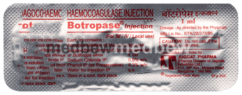 Botropase Injection helps in controlling bleeding by speeding up blood clotting. It helps to prevent excessive loss of blood, stops bleeding and enhances the healing process. This is mainly used in small procedures such as tooth extraction. It is given by a doctor or nurse and should not be self-administered.