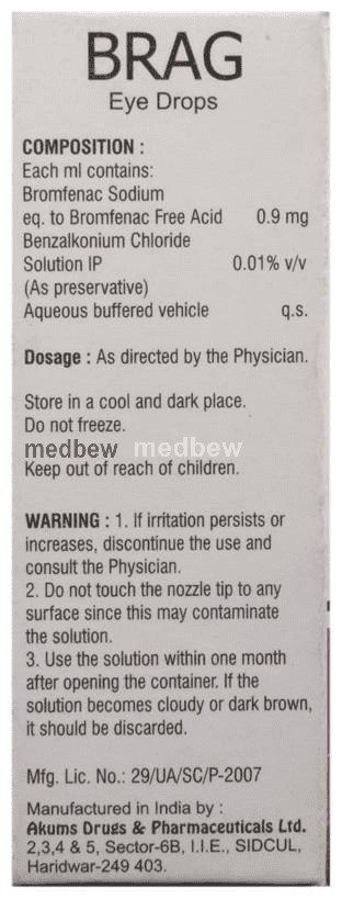 Brag Eye Drops is a pain-relieving medicine. It is used to treat postoperative eye pain and inflammation in patients who have undergone cataract surgery.
