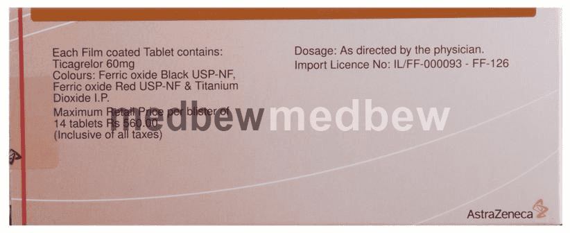 Take this medicine in the dose and duration as advised by your doctor. Swallow it as a whole. Do not chew, crush or break it. Brilinta 60mg Tablet may be taken with or without food, but it is better to take it at a fixed time.