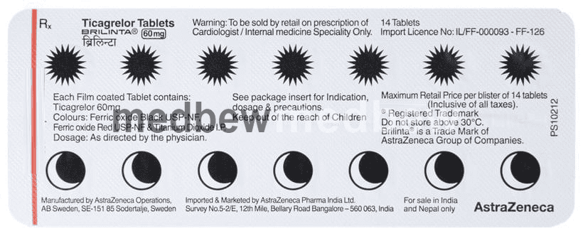 Brilinta 60mg Tablet is an antiplatelet medication. It works by preventing platelets from sticking together, thereby decreasing the formation of harmful blood clots. This lowers the chance of heart attack or stroke.