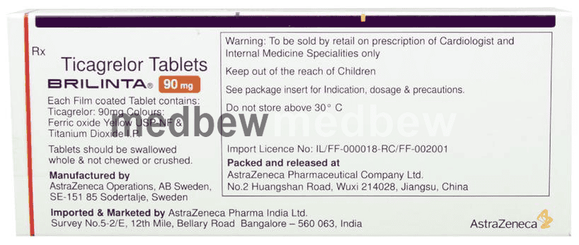 Take this medicine in the dose and duration as advised by your doctor. Swallow it as a whole. Do not chew, crush or break it. Brilinta 90mg Tablet may be taken with or without food, but it is better to take it at a fixed time.