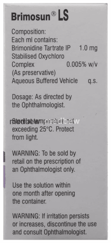 Brimosun LS Eye Drop is used in the treatment of ocular hypertension (pressure in the eye) and glaucoma. It helps to lower high pressure in the eye and reduces the risk of vision loss. This medicine may be used alone or in combination with another eye drop that reduces pressure in the eye.
