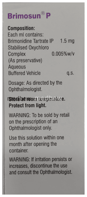 Brimosun P Eye Drop is a combination of two medicines used in the treatment of glaucoma. It decreases the fluid (aqueous humor) production in the eye which relieves the pressure in the eye. This way it relieves the symptom and speeds up the healing.