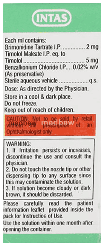 Brimotas T Eye Drop is a prescription medicine used for the treatment of pressure in the eyes (ocular hypertension) and glaucoma. It works by decreasing the pressure of fluid in the eye (aqueous humor), which helps in lowering the increased eye pressure.
