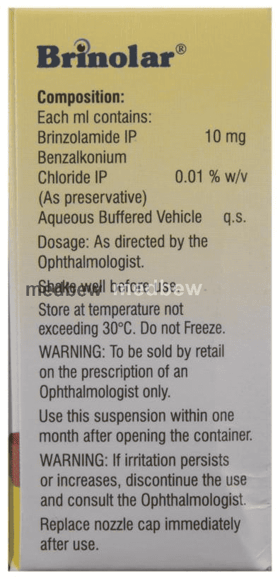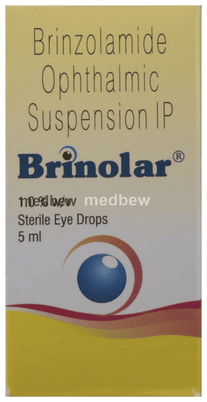 Brinolar Eye Drop is a medicine used to reduce increased pressure in the eye, in people with glaucoma or ocular hypertension(high pressure in the eye). If the pressure in your eye is too high it can damage your sight. Brinolar Eye Drop works by decreasing the amount of fluid inside the eye.