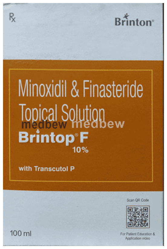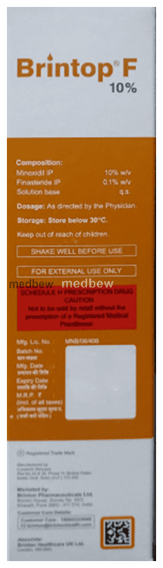 Brintop F 10% Solution is a combination medicine used in the treatment of hair loss in men. It works by increasing blood flow to the hair follicles which further prevents hair loss and stimulates re-growth resulting in longer, thicker and increased numbers of hair.