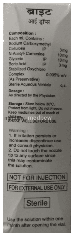 Brite Eye Drop is a prescription medicine used to treat symptoms of dry eyes. It lubricates the eyes helps in maintaining the moisture of the eyes. This way it provides temporary relief from burning and discomfort caused by dry eyes. It also reduces redness and swelling of the eye.