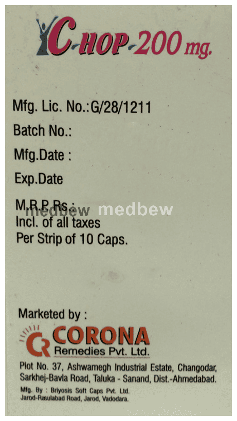 Take this medicine in the dose and duration as advised by your doctor. Swallow it as a whole. Do not chew, crush or break it. C-Hop 200mg Soft Gelatin Capsule is to be taken with food.