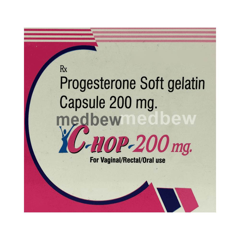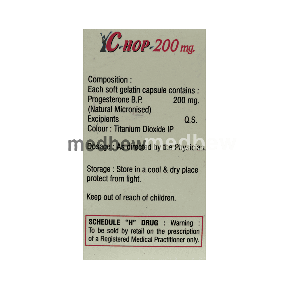 C-Hop 200mg Soft Gelatin Capsule contains progesterone, a female hormone that is important in the regulation of ovulation and menstruation. It is used to cause menstrual periods in women who have not reached menopause but are not having periods due to a lack of natural progesterone in the body. This medicine helps to prepare the uterus for pregnancy by causing the uterus lining (endometrium) to thicken. This increases the chance of a successful pregnancy. You should use the medicine as prescribed for it to be effective. You may be asked to continue with this treatment for a period after becoming pregnant.show moreshow less