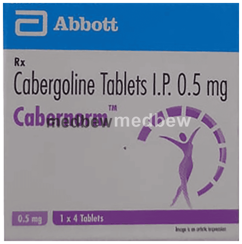 Cabernorm 0.5mg Tablet contains Cabergoline, which belongs to a group of medicines that reduces the level of prolactin. It is used to treat medical problems such as galactorrhoea due to abnormally high level of prolactin. It is also used to stops breast milk production (lactation) in case of stillbirth, abortion or miscarriage.