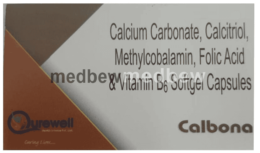 Calbona Soft Gelatin Capsule is a combination of five nutritional supplements. Calcium increases calcium depositing in the bones which increases the density of the bones to them stronger. Calcitriol is a synthetic Vitamin D that regulates the absorption of calcium in the body and strengthens the bones. Methylcobalamin is an active form of Vitamin B 12. This helps in proper cell growth and development, helps in protein synthesis and production of blood cells (red and white blood cells). Folic Acid is also known as folate or vitamin B9. It helps in producing blood (hemoglobin) in the body. Vitamin B6 (Pyridoxine) is a vitamin nutritional supplement that regulates essential metabolic functions. This is how it works in the treatment ofย nutritional deficiencies.