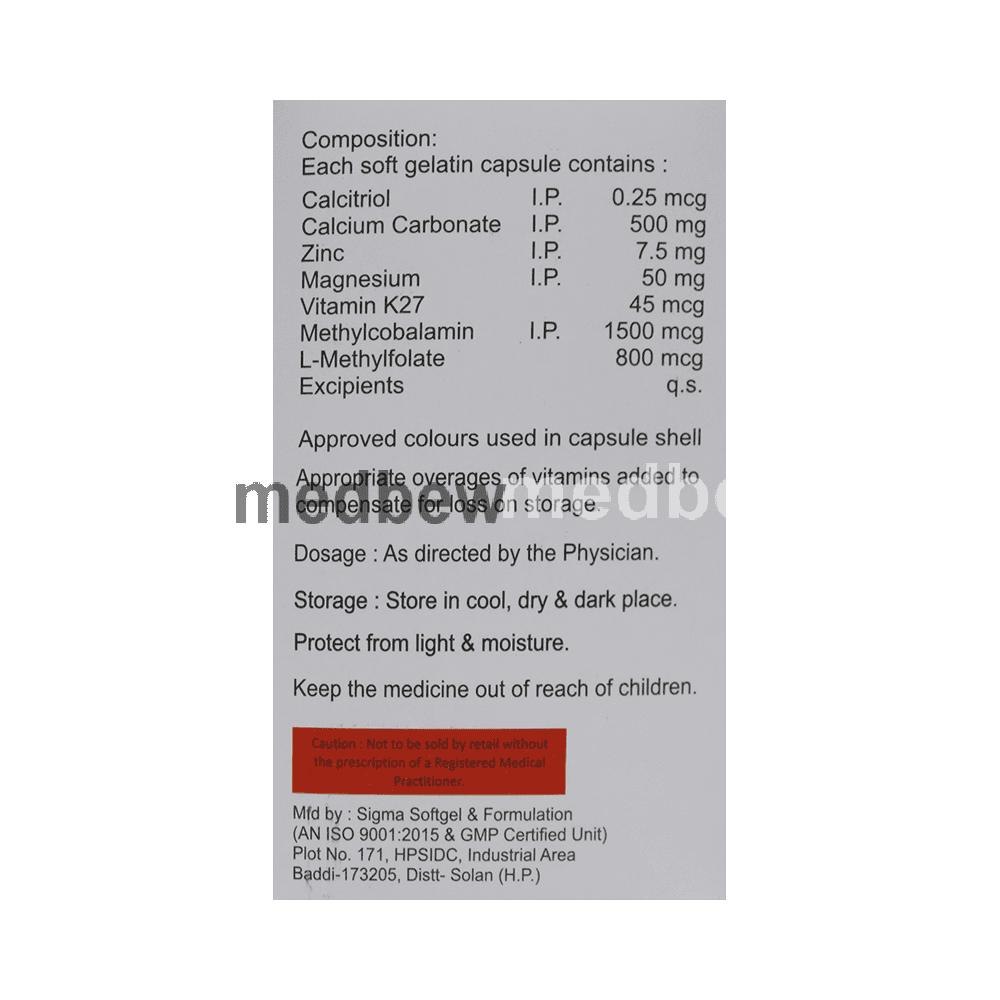 Composition Calcitriol (0.25mcg) + Calcium Carbonate (500mg) + Zinc (7.5mg) + Magnesium (50mg) + Vitamin K2-7 (40mcg) + Methylcobalamin (1500mcg) + L-Methyl Folate (800mcg)