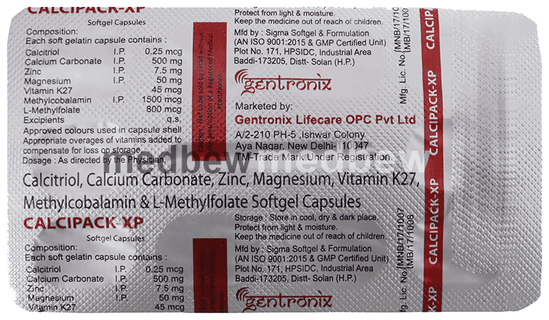 Calcipack-XP Softgel Capsule is a combination of seven medicines : Calcitriol, Calcium Carbonate, Zinc, Magnesium, Vitamin K2-7, Methylcobalamin, and L-Methyl Folate. Calcitriol is the active form of Vitamin D. It raises Vitamin D levels in your blood. This in turn raises calcium levels in your blood by helping you absorb more calcium from your intestine. Calcium carbonate is a dietary supplement used when the amount of calcium taken in the diet is not enough. Zinc is a nutritional supplement that provides essential nutrients to our body and improves overall health. Magnesium is an antacid that neutralizes the excessive acid in the stomach. Vitamin K2-7 plays a central role in the metabolism of calcium, the main mineral found in your bones and teeth. Vitamin K2-7 activates the calcium-binding actions of two proteins : matrix GLA protein and osteocalcin, which help to build and maintain bone health. Methylcobalamin is a form of vitamin B12 that restores its level in the body thereby helping in treating certain anemias and nerve problems. L-Methyl Folate is the primary biologically active isomer of folic acid and the primary form of folate in circulation. Folic Acid is a form of vitamin B. It plays a vital role in the formation of red blood cells, which carry oxygen throughout the body. It is also essential in pregnancy due to its role in the development of the unborn baby’s brain and spinal cord.