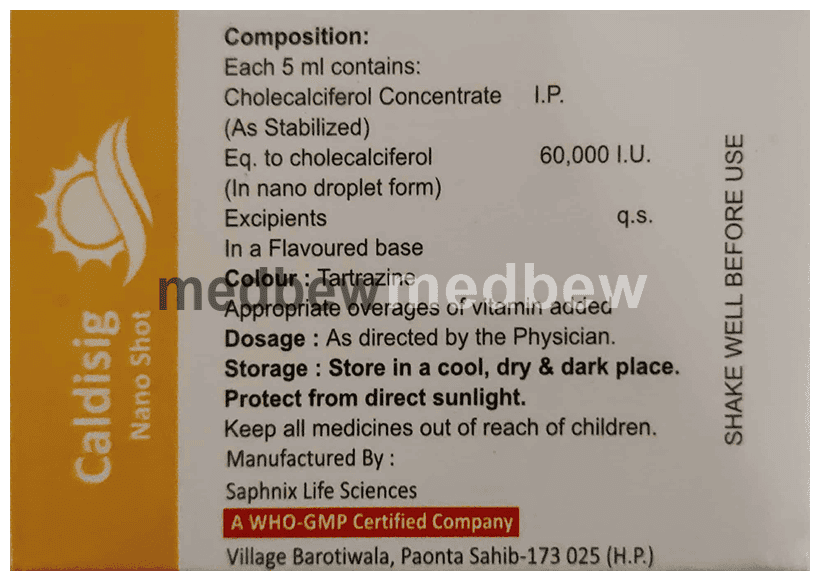 Take this medicine in the dose and duration as advised by your doctor. Check the label for directions before use. Measure it with a measuring cup and take it by mouth. Shake well before use. Caldisig Nano Shot is to be taken with food.