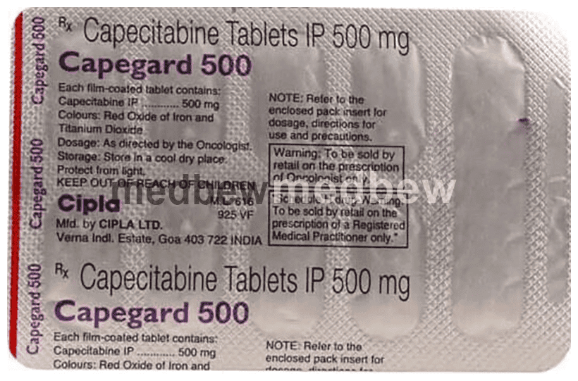 Capegard 500 Tablet helps to treat breast cancer and it may be used alone or in combination with other medicines or treatment modalities like chemotherapy. It relieves the symptoms of breast cancer such as breast lumps, bloody discharge from nipples or changes in the shape or texture of the breast. Capegard 500 Tablet kills or stops the growth of cancer cells and also prevents the multiplication of cancer cells. Discuss with your doctor if any of the side effects bother you.