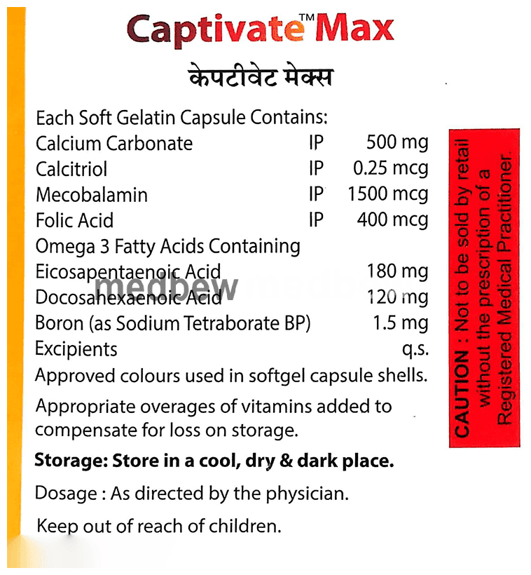 Captivate Max Soft Gelatin Capsule is a nutritional supplement that helps in proper brain function, boosting body energy levels and is important for proper functioning of the nervous system. Captivate Max Soft Gelatin Capsule also helps in the formation of red blood cells and enhances the absorption of iron in the body. This improves the level of hemoglobin and thus reduces the risk of anemia. Captivate Max Soft Gelatin Capsule improves the level of vitamin D in your blood which in turn helps in absorption of more calcium from your intestine. It will help to keep your bones strong and healthy and reduce the risk of them becoming weak and more likely to break.