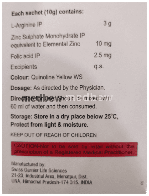 Composition L-Arginine (3mg) + Zinc Sulphate Monohydrate (10mg) + Folic Acid (2.5mg)