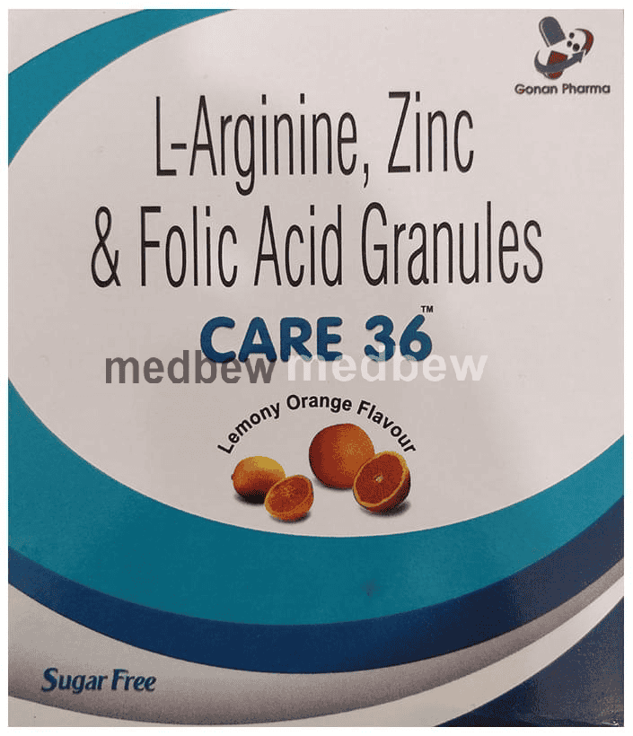 Care 36 Sachet Lemony Orange Sugar Free is a combination of three medicines : L-Arginine, Zinc Sulphate Monohydrate, and Folic Acid. L-arginine is an amino acid. It works by improving blood flow to the muscles by widening the blood vessels. This improves growth of muscles. Zinc Sulphate Monohydrate is a nutritional supplement that provides essential nutrients to our body and improves overall health. Folic Acid is a form of vitamin B. It plays a vital role in the formation of red blood cells, which carry oxygen throughout the body. It is also essential in pregnancy due to its role in the development of the unborn baby’s brain and spinal cord.