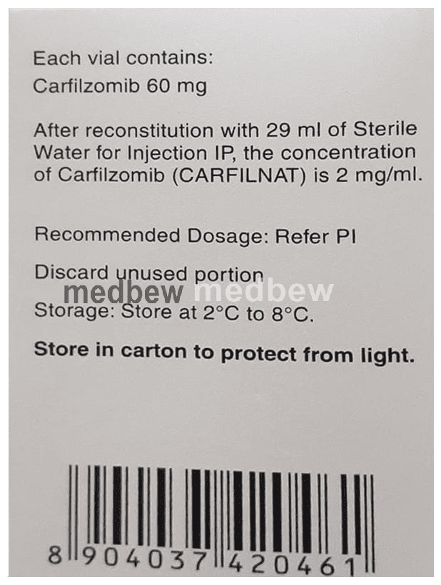 Carfilnat Injection in combination with other medications is for patients with relapsed multiple myeloma (multiple myeloma that has returned) and for refractory multiple myeloma (multiple myeloma that no longer responds to treatment). talk to your doctor in case of any doubts.