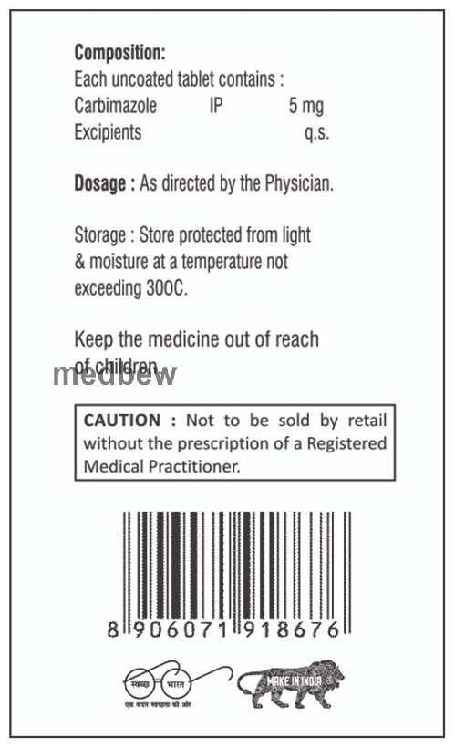 Carkozom 5 Tablet is an anti-thyroid medication. It works by reducing the amount of thyroid hormones produced by the thyroid gland.