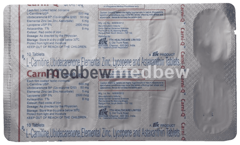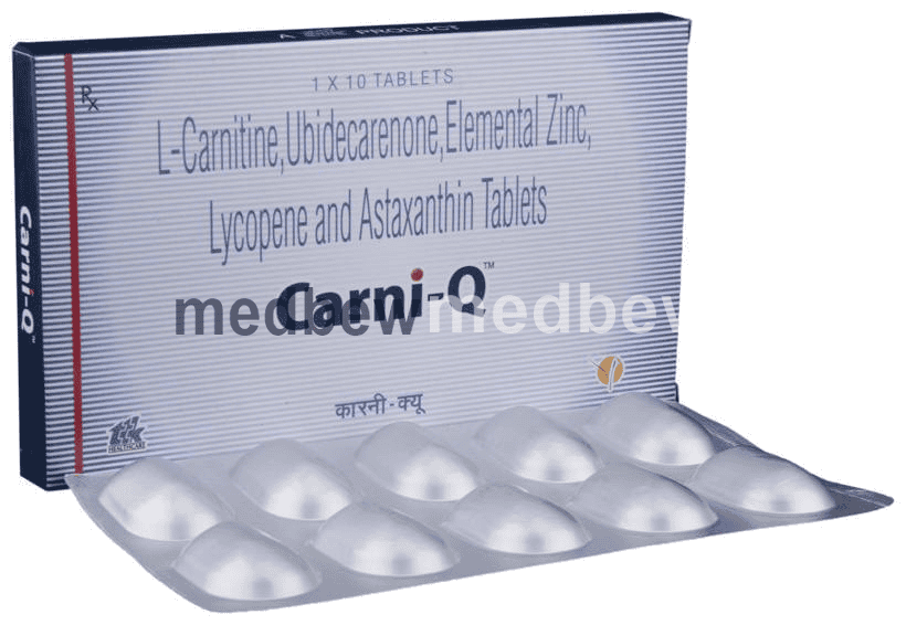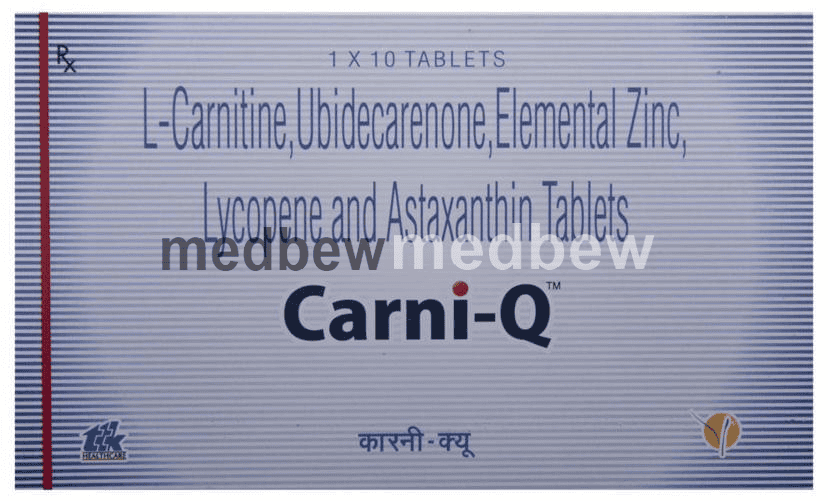 Carni-Q Tablet is a combination of five medicines: Levo-carnitine, Coenzyme Q10, Zinc, Lycopene and Astaxanthin. Levo-carnitine, Zinc and Lycopene provide essential nutrients. Coenzyme Q10 and Astaxanthin are antioxidants which protect the body from damage by chemicals (free radicals).