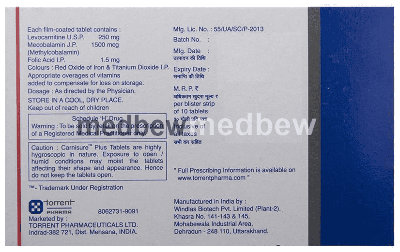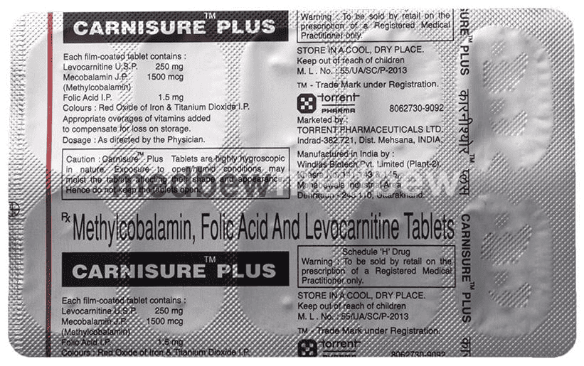 Carnisure Plus Tablet is a combination of three nutritional supplements: Levo-carnitine, Methylcobalamin, and Folic Acid which replenish the body’s stores of important nutrients.