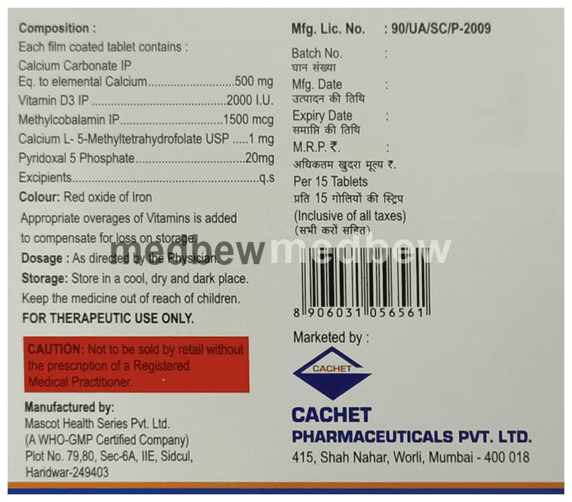 Composition Calcium Carbonate (500mg) + Vitamin D3 (2000IU) + Methylcobalamin (1500mcg) + L-Methyl Folate Calcium (1mg) + Pyridoxal-5-phosphate (20mg)