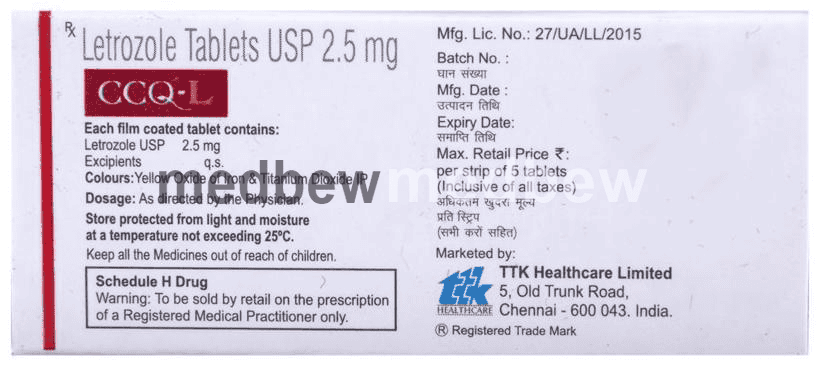 CCQ-L Tablet is an aromatase inhibitor. It is generally prescribed to treat breast cancer in women who no longer have periods, either due to menopause or after surgery or chemotherapy. It is also used to treat infertility caused due to anovulation (during menstrual cycle egg cell from ovaries is not released).