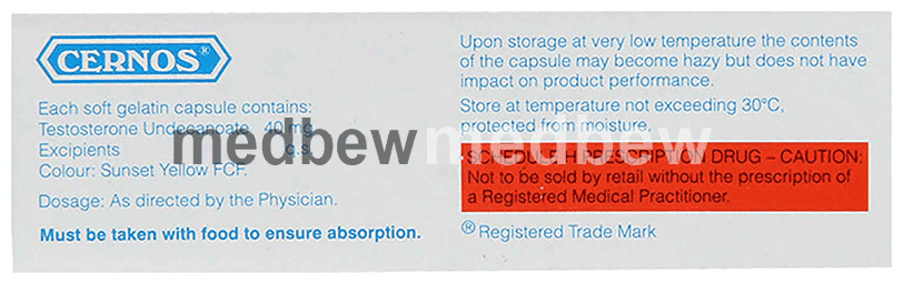 Cernos Soft Gelatin Capsule is an injectable preparation which contains a synthetic form of testosterone (a male sex hormone). It is used in the treatment of male hypogonadism (a condition in which the body does not produce enough testosterone).