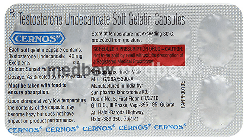 Cernos Soft Gelatin Capsule is similar to the natural male hormone, testosterone. It works by replenishing the deficient testosterone levels in adult men. Lack of testosterone may cause various health problems including impotence, infertility, low sex drive, tiredness, depressive mood and bone loss.