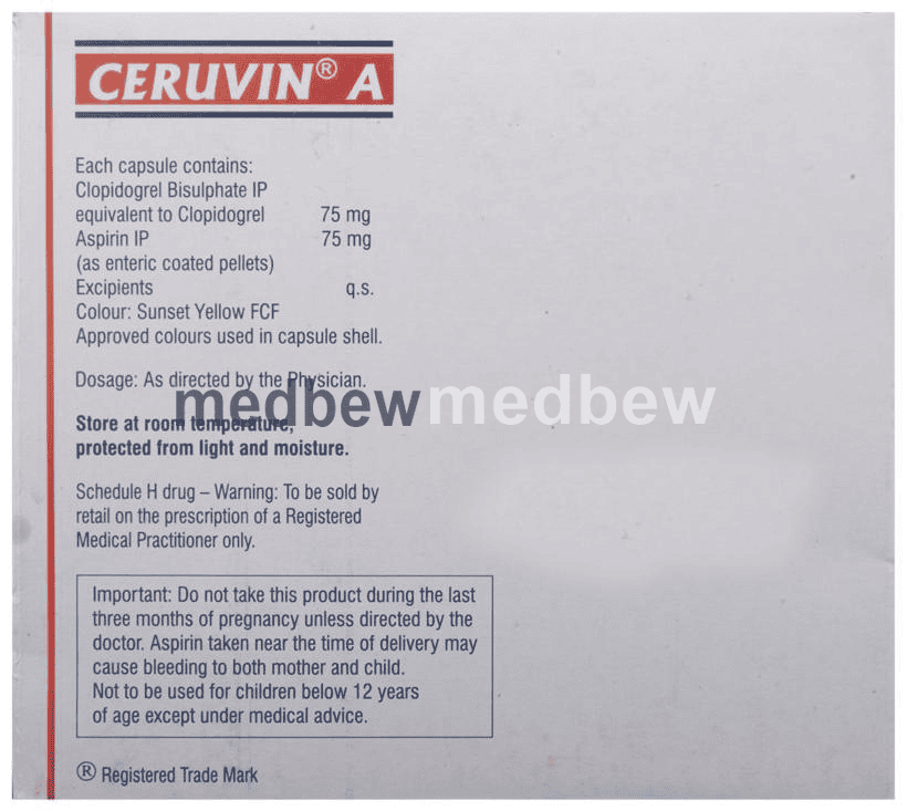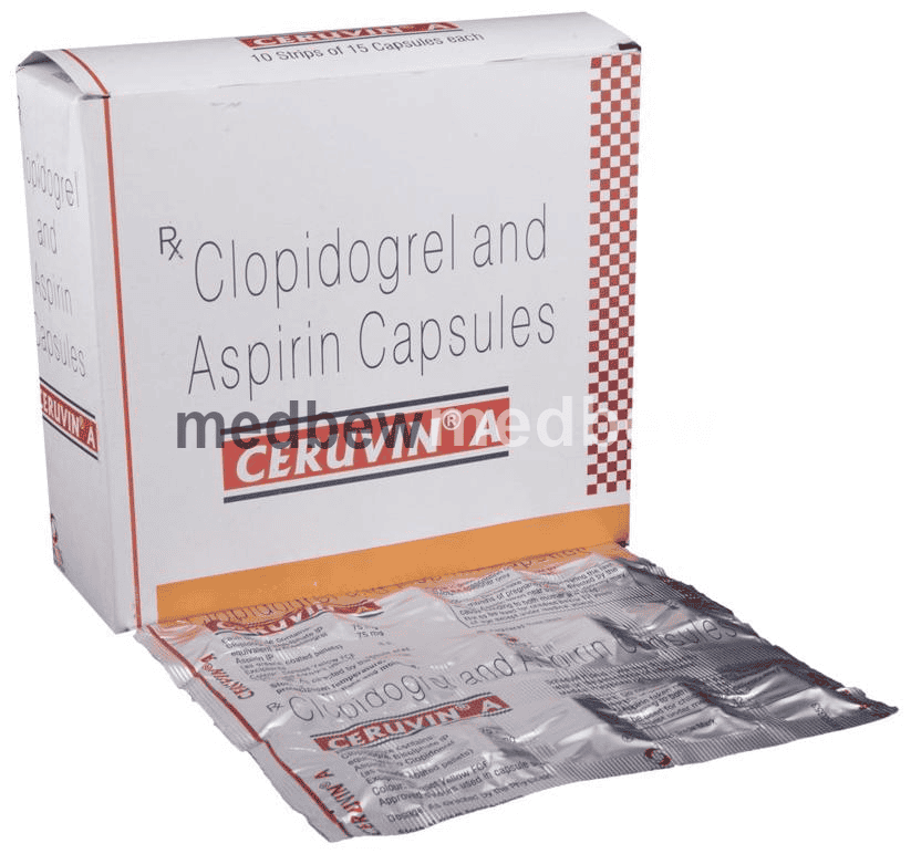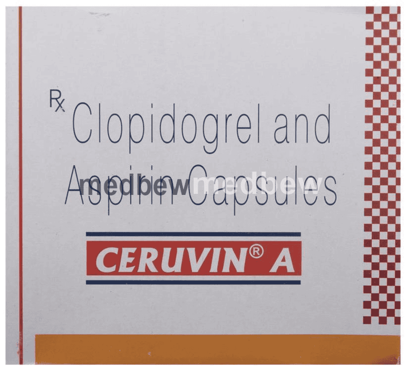 Ceruvin A Capsule is a combination of two antiplatelet medicines: Aspirin and Clopidogrel which prevent heart attack. They work by preventing the platelets from sticking together and decrease the formation of harmful blood clots.