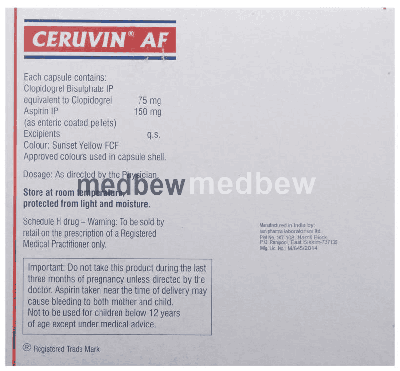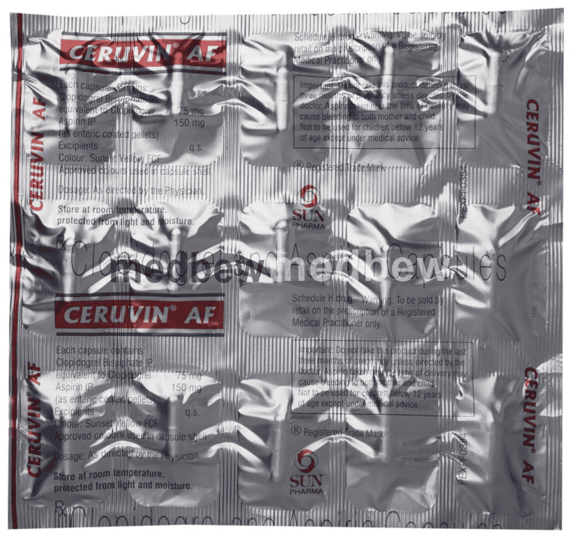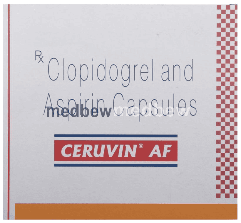 Ceruvin AF Capsule is a combination of two antiplatelet medicines: Aspirin and Clopidogrel which prevent heart attack. They work by preventing the platelets from sticking together and decrease the formation of harmful blood clots.