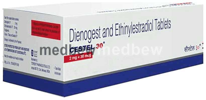 Cestel 30 Tablet is a combination of two medicines. Ethinyl Estradiol and Dienogest are two synthetic hormones that inhibit ovulation (release of an egg from an ovary) in women to prevent unintended pregnancy. It also protects the sperms from entering into the uterus (womb) by changing the mucus consistency of the vagina and cervix (passage to the womb).