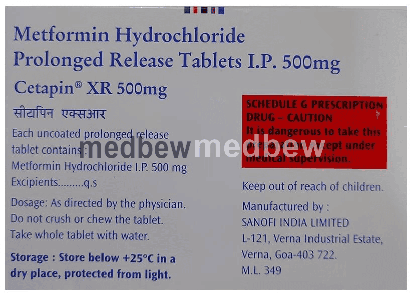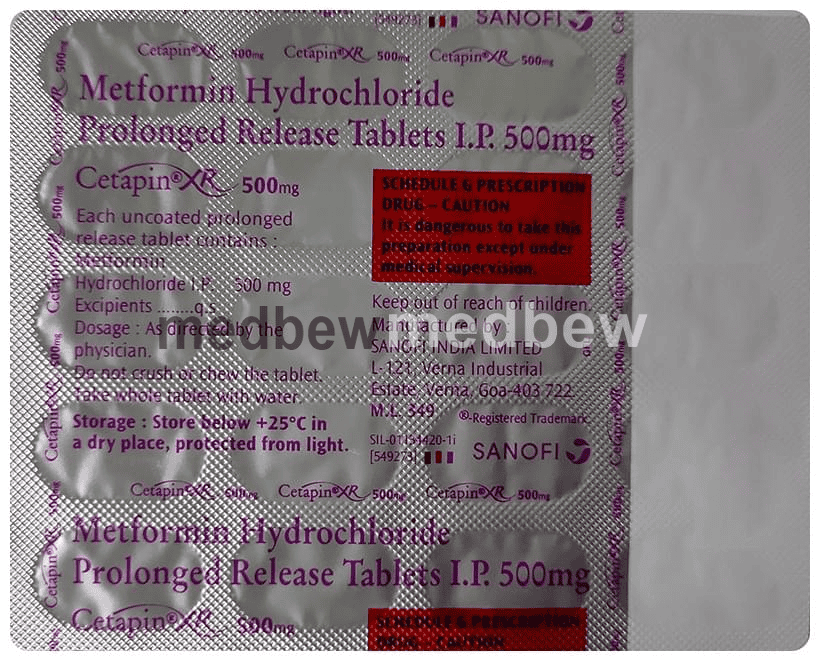 Cetapin XR 500mg Tablet is a medicine used to treat type 2 diabetes mellitus. It helps control blood sugar levels and thus prevent serious complications of diabetes. It is also used to treat a menstruation-related disorder known as Polycystic ovary syndrome (PCOS) in women.
